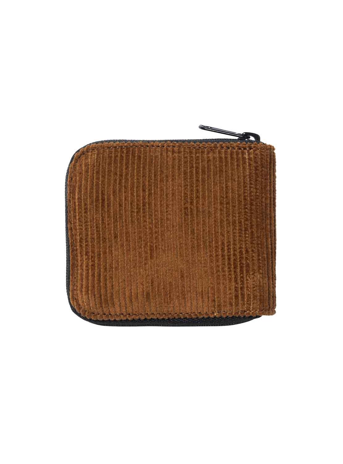 Carteira Carhartt. Medidas: 9x22,5cm. Cor marrom. Tecido veludo cotelê. Forrado. Fecho de correr. Carteira Bolso. Verticais ocultas do Bolso em ambos os lados. Carteira Bolso com aba. Três bolsos para cartões. Etiqueta de marca quadrada.