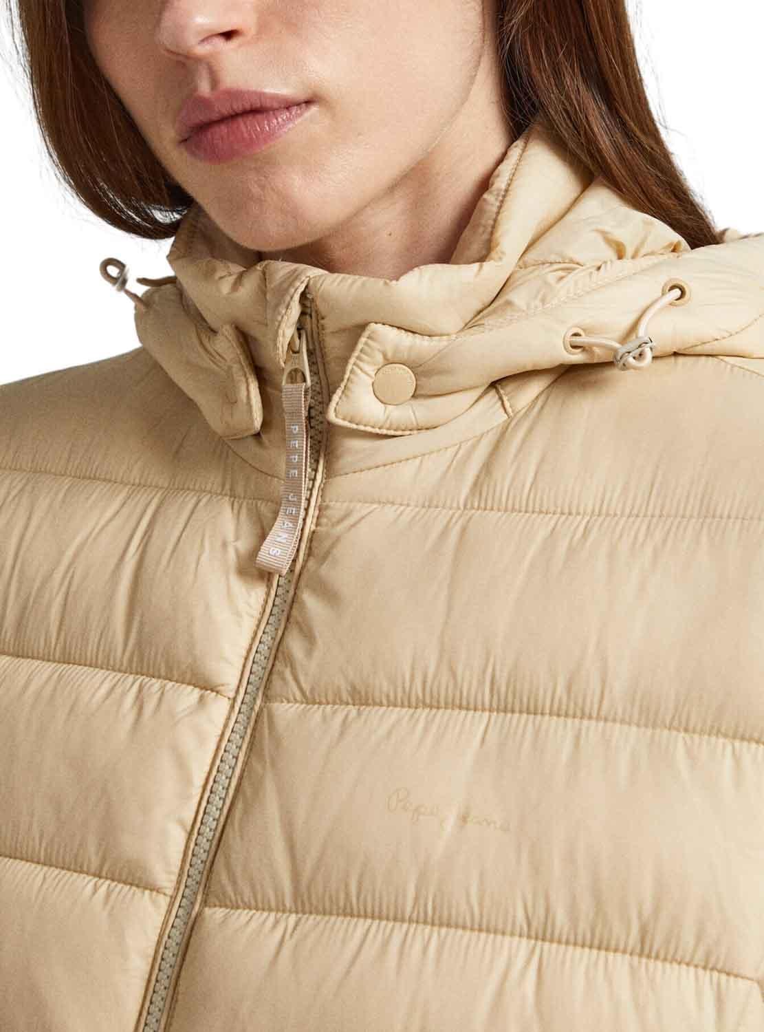 Casaco de pluma Pepe Jeans. Cor bege. Acolchoado. Tecido resistente à água. Capuz destacável. Fecho frontal com zíper. Combinando Logo no peito. Lado Bolsos. Manga longo. A modelo está usando tamanho S.