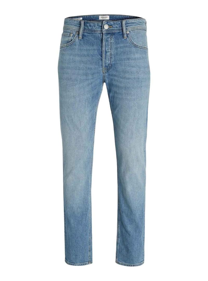 Pantalon Jeans Jack & Jones. Modelo Mike. Denim claro. Corte skinny. Cinco bolsos. Efeito desgastado. Patch da marca na cintura.