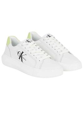 Sapatilhas Calvin Klein. Cupsole Modelo Chunky. Cor branco com detalhes verdes. Fechamento com cadarço. Couro Parte de cima. Forro em mistura de lã reciclada. Interior confortável em espuma. Altura do salto 4,1 cm.
