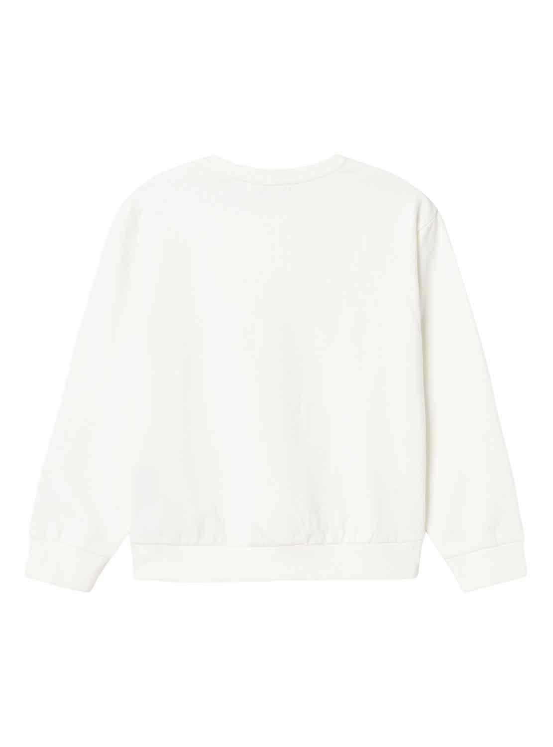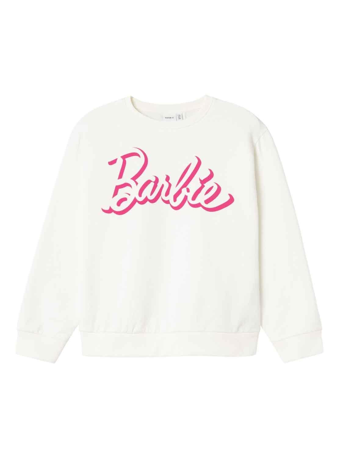 Sweat Name It. Modelo Dalma. Cor branco. Logo Barbie estampada em frontal. Pescoço redondo. Extremidades nervuradas. Regular fit