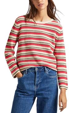 Camisola Pepe Jeans. Printed e Listras testados. Pescoço redondo. Manga longo. Fit cortado. A modelo está usando tamanho S.