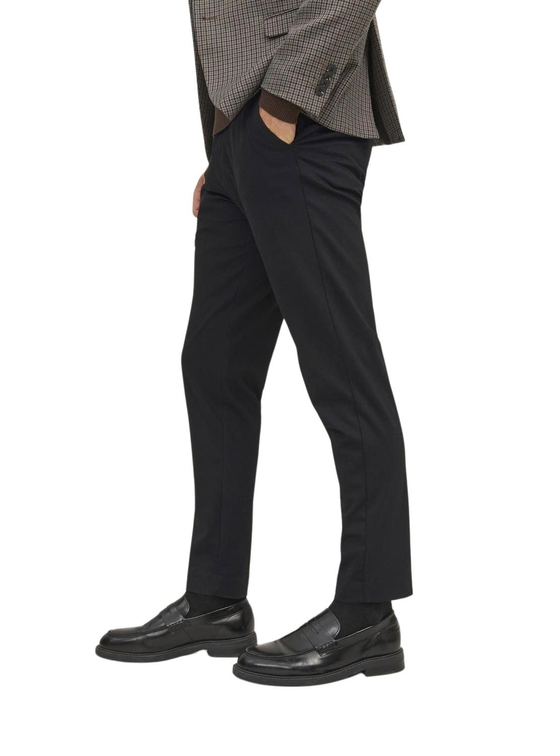 Calças Chino Jack & Jones. Modelo Marco Cooper Chino. Cor preto. Fecho com zíper e botão. Presilhas para cinto para. Lado Bolsos. Bolsos na parte traseira. Logo metálico. A modelo está usando o tamanho 3232.