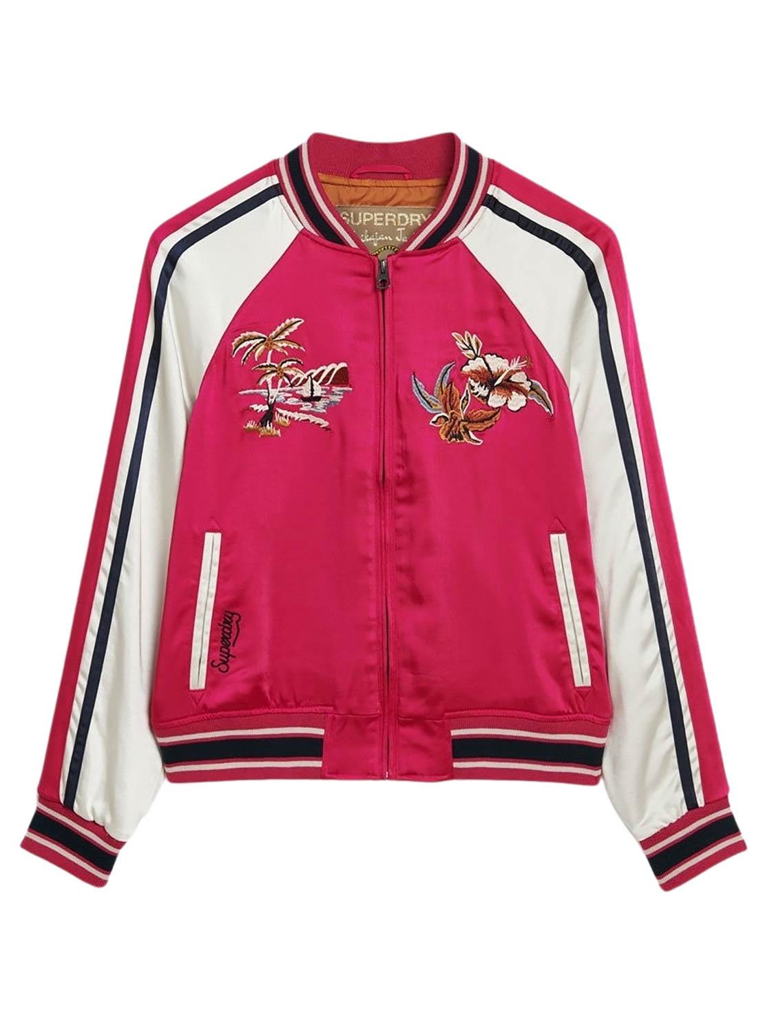 Casaco Superdry. Modelo Suikajan. Cor rosa. Mangas compridas em contraste. Fecho de zíper. 2 bolsos laterais. Detalhes bordados no peito e nas costas. Corte regular.