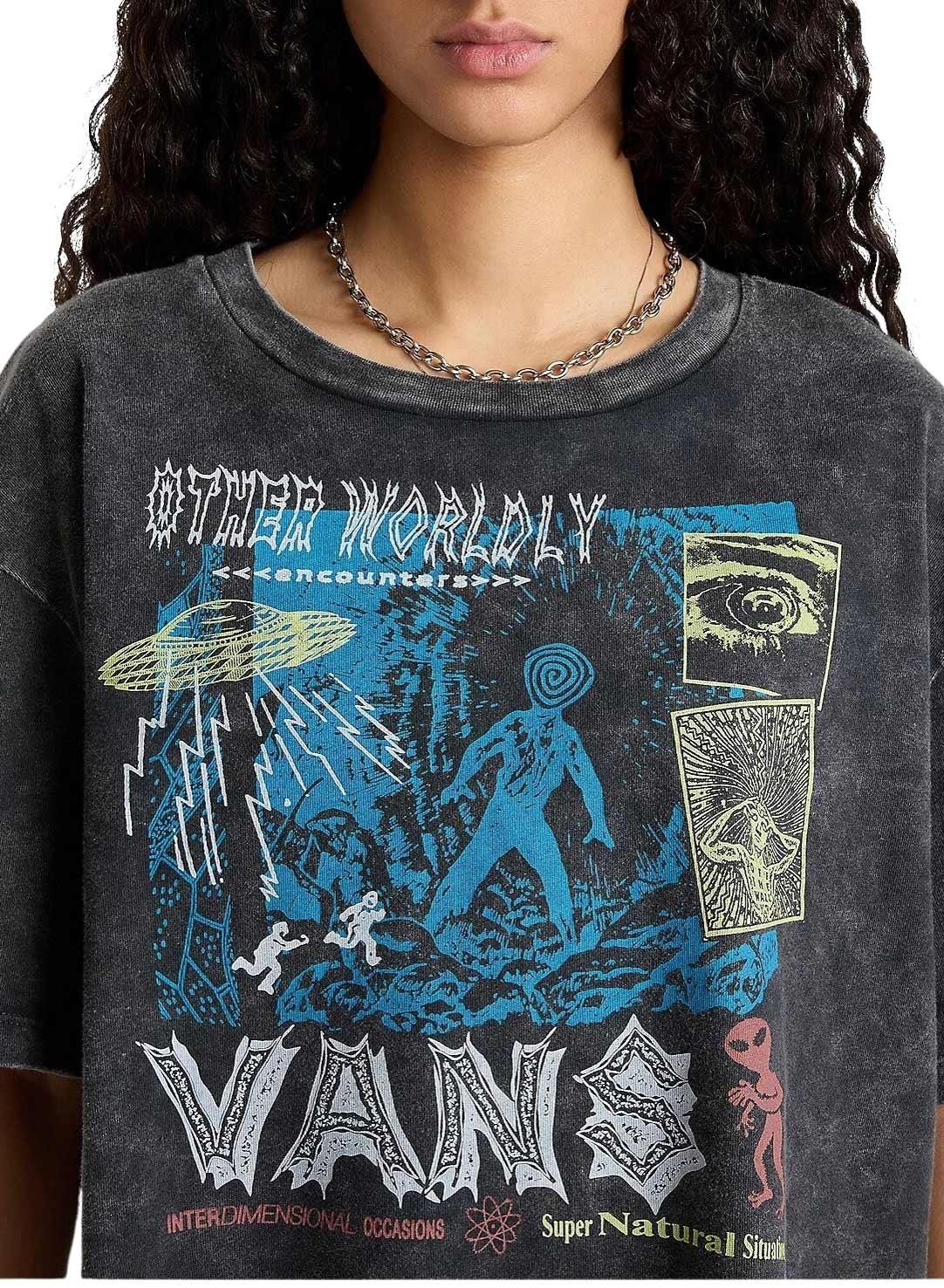 Camiseta Vans. Cor preta. Tecido lavado. Manga curta. Gola redonda. Estampa gráfica na frente. Formato curto. Corte folgado.