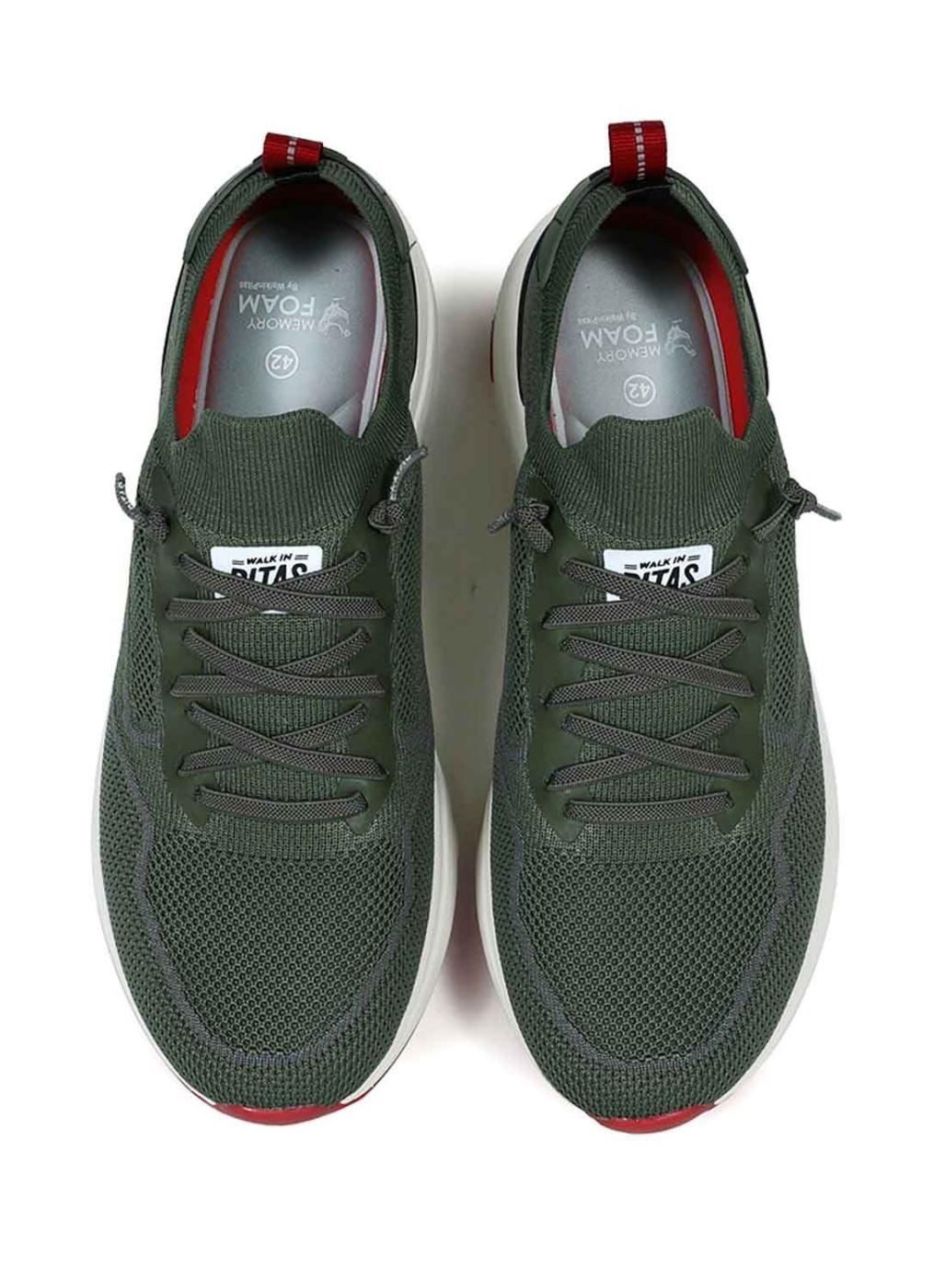 Sapatilhas Walkin Pitas. Modelo Cue. Cor verde. Fecho com cadarços elásticos. Leve e versátil. Parte superior em malha reciclada respirável. Gola elástica. Palmilha de espuma com memória. Sola de EVA ultraleve em branco.
