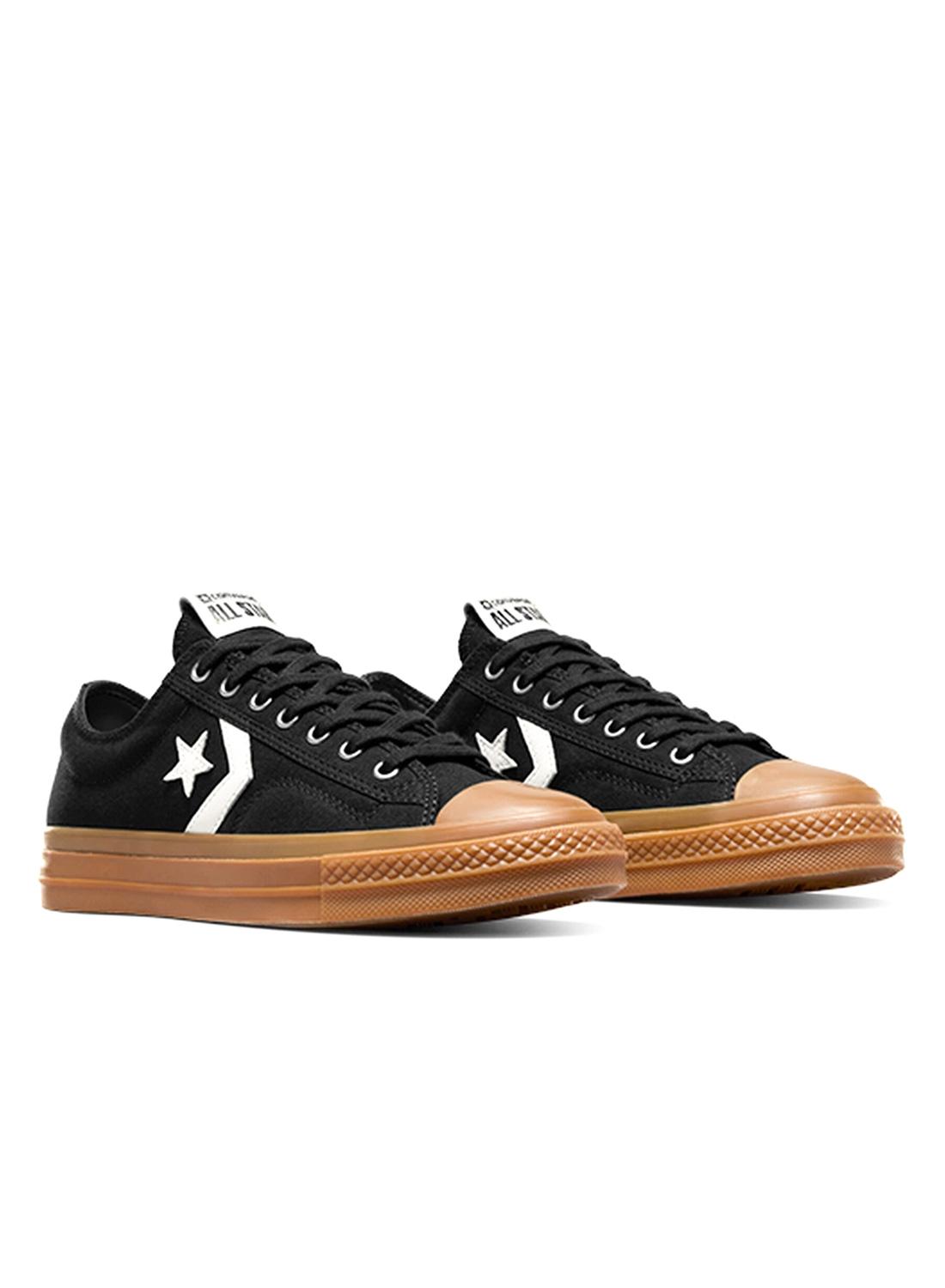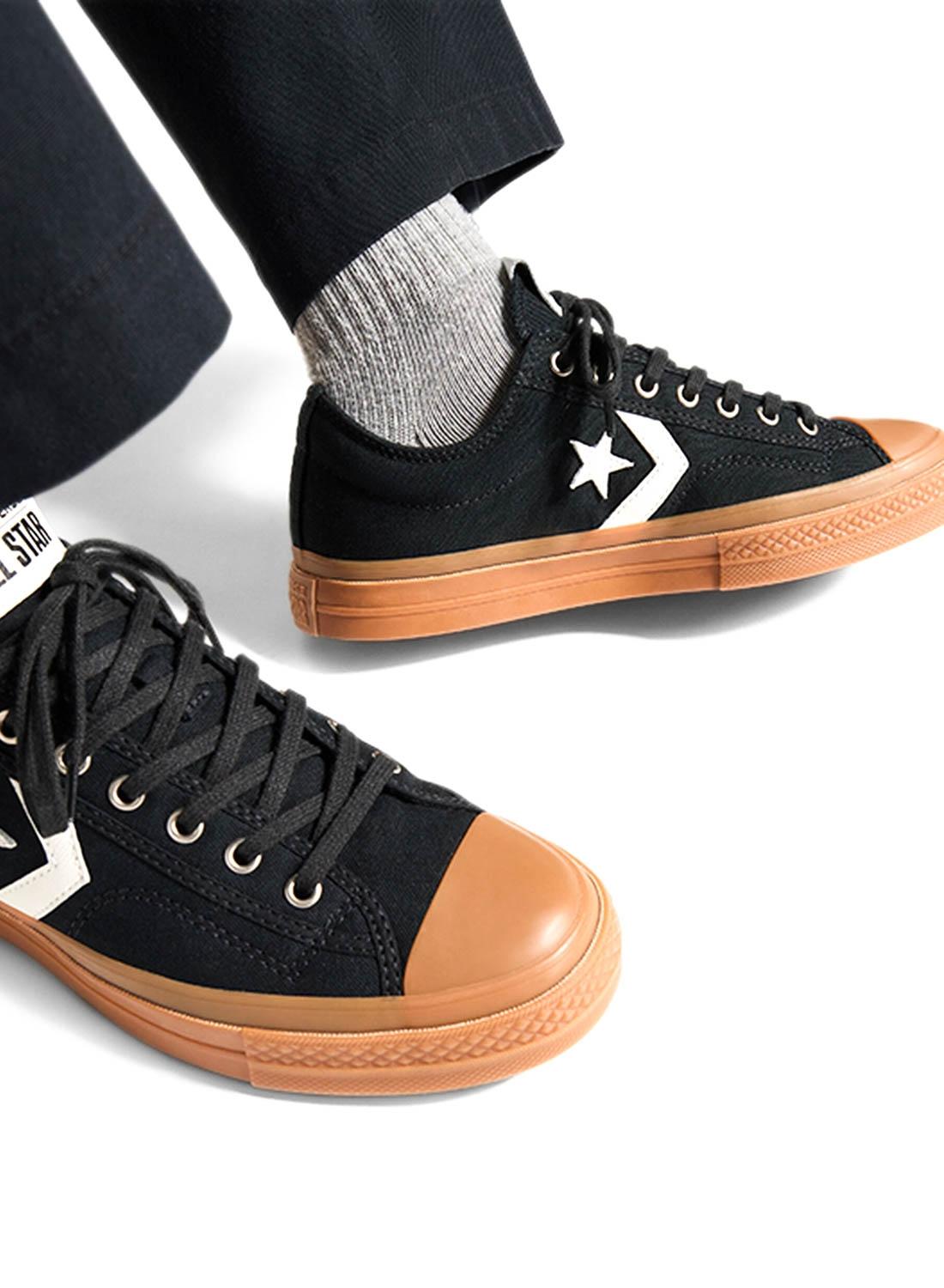 Tênis Converse. Modelo Star Player 76. Cor preta. Corte baixo. Parte superior de lona. Amortecimento OrthoLite. Ponta texturizada. Logotipo de estrela e guarnição em couro. Logotipo traseiro de estilo vintage. Sola cor caramelo.