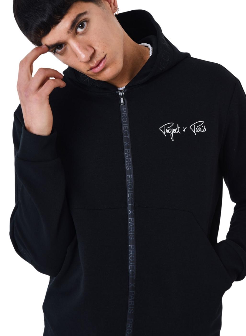 Moletom com zíper Proyect x Paris. Cor preta. Com capuz. Zíper com marca termosselada. Logo bordado no peito. Bolsos laterais. Extremidades caneladas. Ajuste regular.