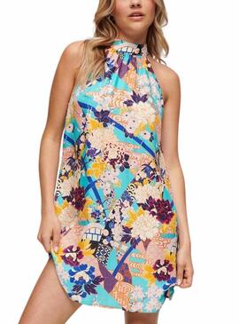 Vestido Superdry. Modelo Aqua. Multicolor. Gola alta. Corte mini. Decote nas costas. Estampa oriental. Tecido leve.