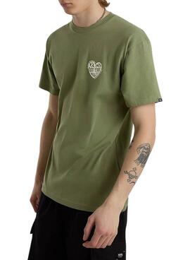 Camiseta Vans. Modelo No players. Cor verde. Gola redonda. Manga curta. Ajuste regular. Logo estampado. Coração estampado nas costas. Detalhes em bege.