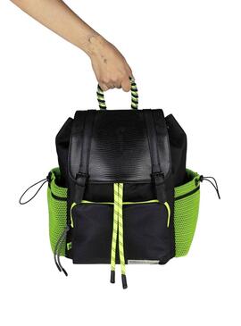 Mochila Munich. Cor preto. Modelo Deep. Bolso frontal e dois laterais com zíper. Fechamento com cordão na parte superior e aba com duplo fecho magnético. Interior com duplo organizador e bolso com zíper. Alças de ombro ajustáveis. Puxadores com detalhes neon e acabamentos em silicone.