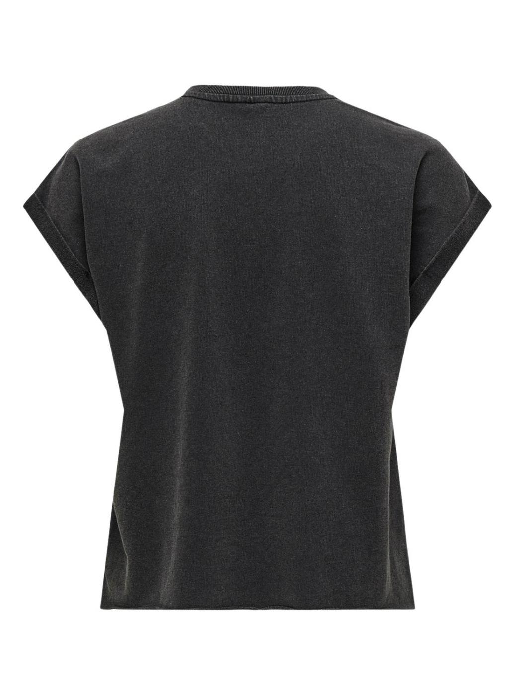 Camiseta Only. Modelo Lucinda. Cor preto. Gola redonda. Manga curta com dobra. Borda inferior sem acabamento. Efeito desgastado. Ilustração na parte da frente.