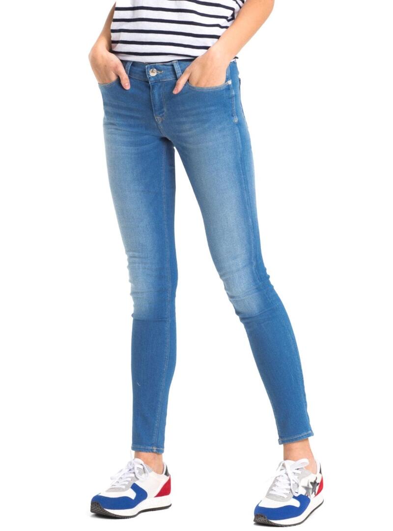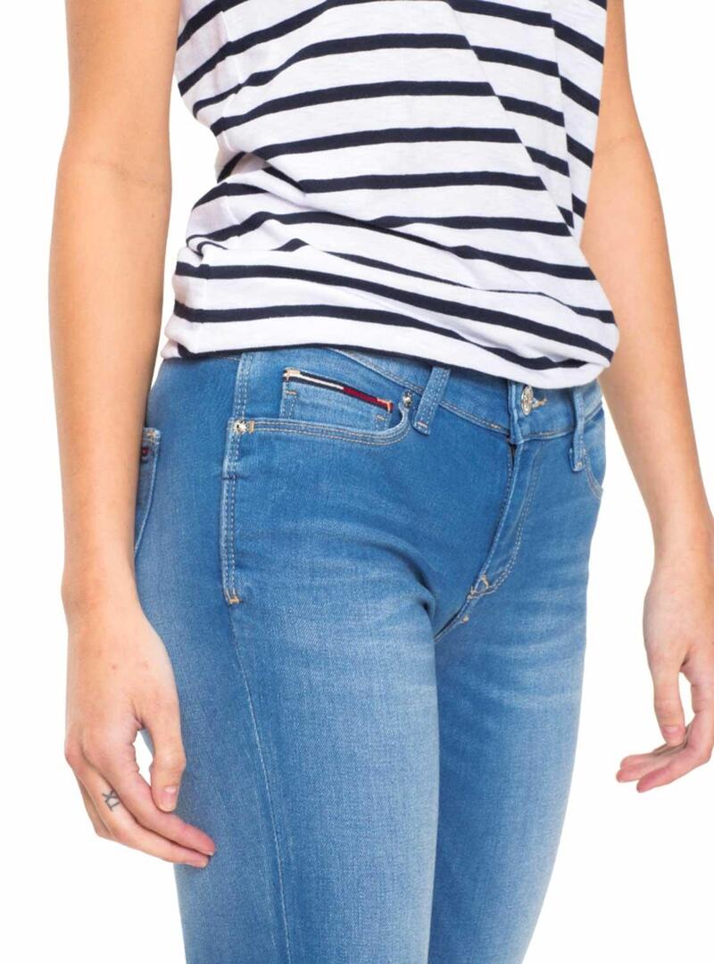 Jeans Tommy Jeans. Modelo Nora. Cor azul. Tecido denim elástico. 5 bolsos Formato cabido Fecho de botão e fecho de correr. Cintura média Skinny O modelo usa tamanho 27.