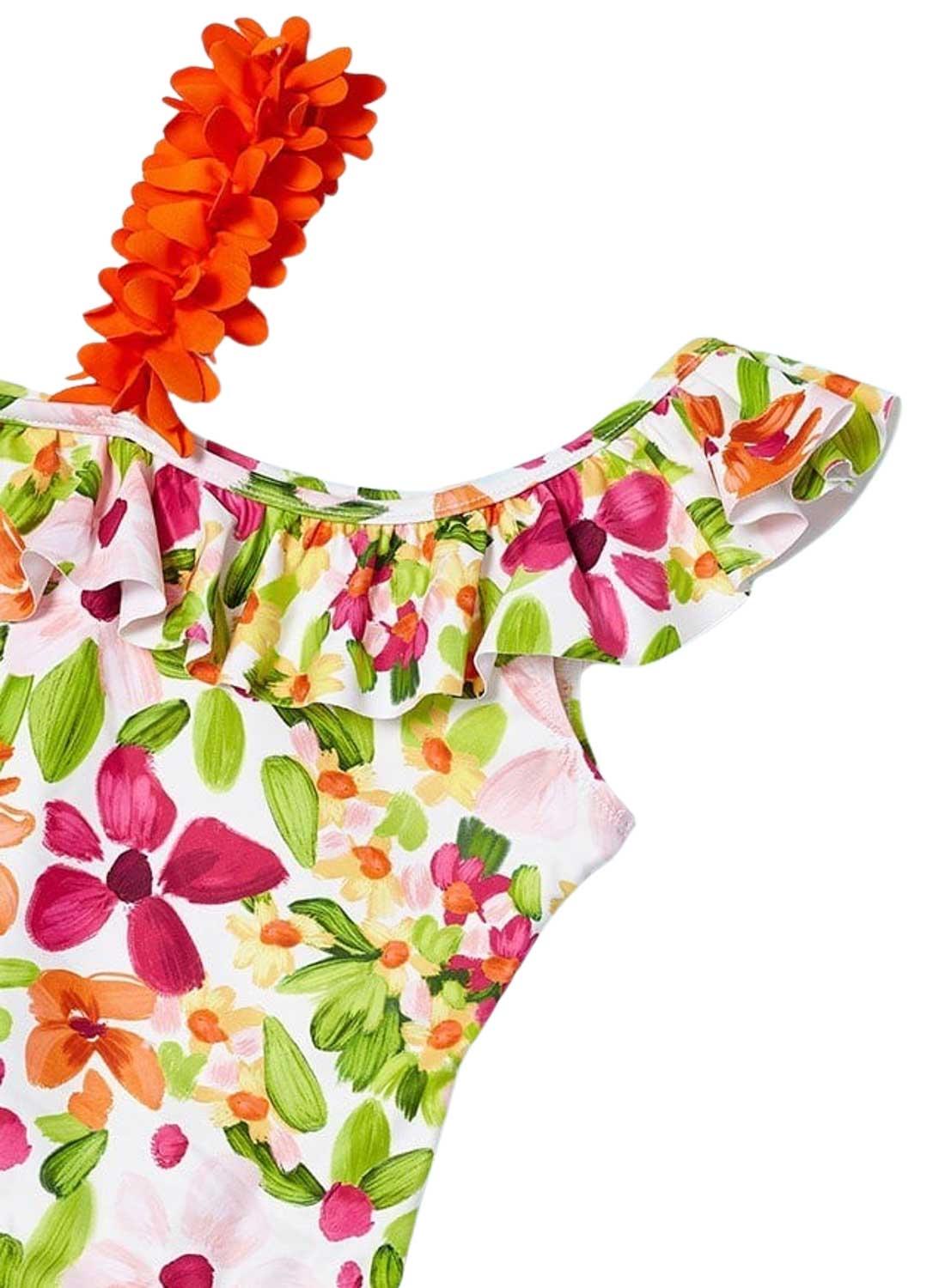 Fato de banho Mayoral. Estampa floral. Assimétrico. Uma alça laranja com flores. Babado na parte superior.