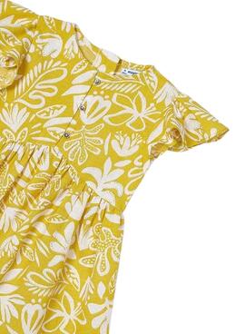 Vestido Mayoral. Estampado tropical. Gola redonda. Sem mangas. Babados nos ombros. Gola com três botões. Corte no peito. Formato curto.