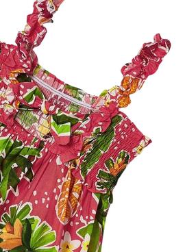 Vestido Mayoral. Com tiara. Estampado tropical. Com alças. Parte superior franzida. Com babados. Abertura nas costas. Detalhe de laço nas costas.