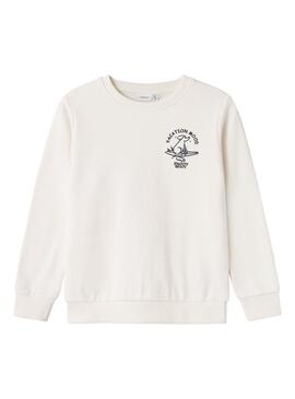 Moletom Name It. Modelo Fota. Cor branca. Manga comprida. Gola redonda. Estampa gráfica no peito e nas costas. Caimento regular.