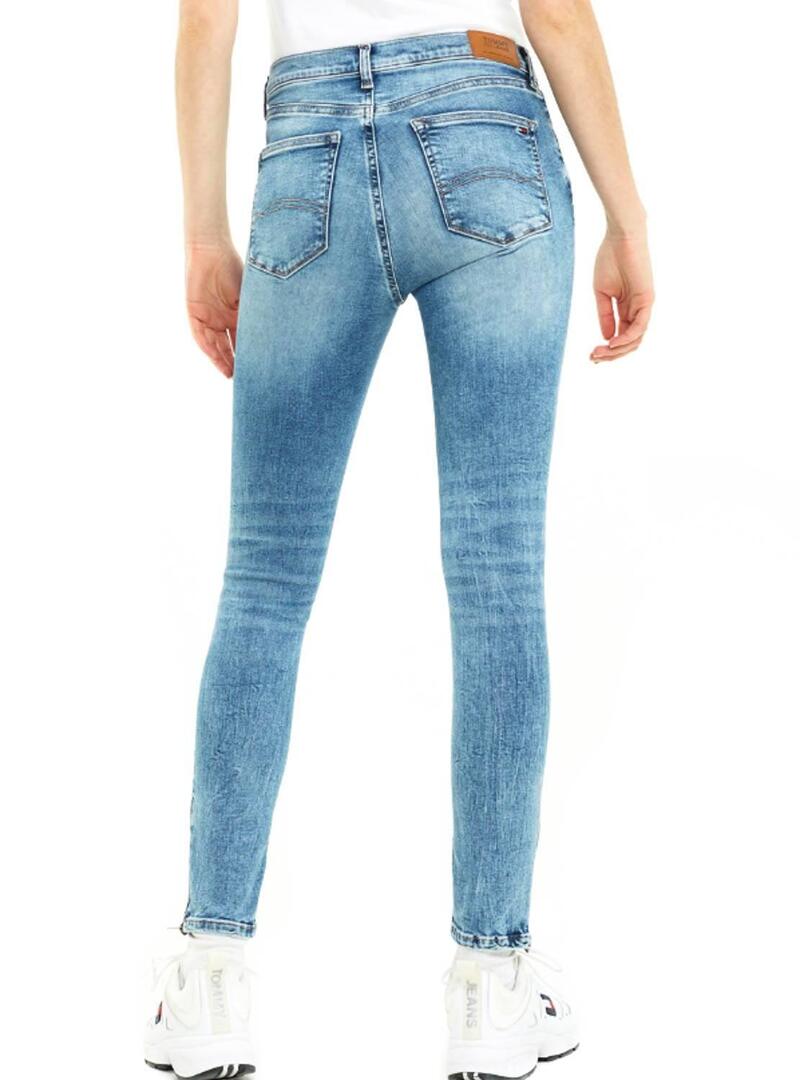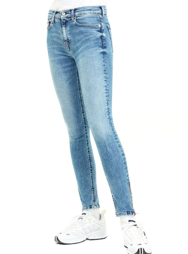 Jeans Tommy Jeans. Modelo Nora 7/8. Denim claro. Efeito gasto. Mid rise. Fecho de botão e zíper. Super skinny. Long pelo tornozelo. Em con zíper. Cinco bolsos. Logotipo bordado no bolso de trás.