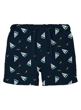Fato de banho Name It. Cor marinho. Estampado de marinheiro. Cintura de borracha ajustável no interior. Com cordões fixos.