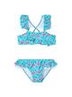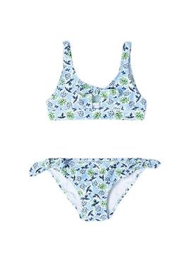 Biquíni Mayoral. Estampado. Cor azul. Top com abertura frontal. Detalhe de laço no peito. Laços laterais.