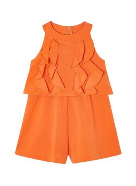 Overall Mayoral. Cor laranja. Gola redonda. Sem mangas. Efeito dupla peça. Parte superior com babados. Fecho traseiro com dois botões.