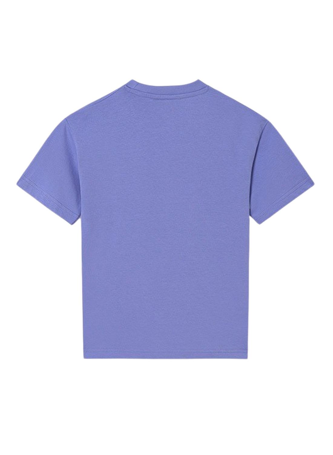 Camiseta Mayoral. Cor lilás. Modelo básico. Gola redonda. Manga curta. Estampado no peito. Formato regular.
