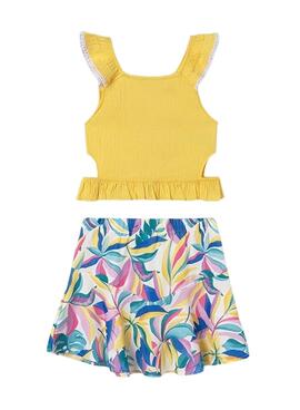 Conjunto Mayoral. 2 peças. Top curto. Cor amarela. Manga cavada com babados. Aberturas laterais. Cintura com babados. Saia curta com rodado. Estampada. Cintura de elástico.