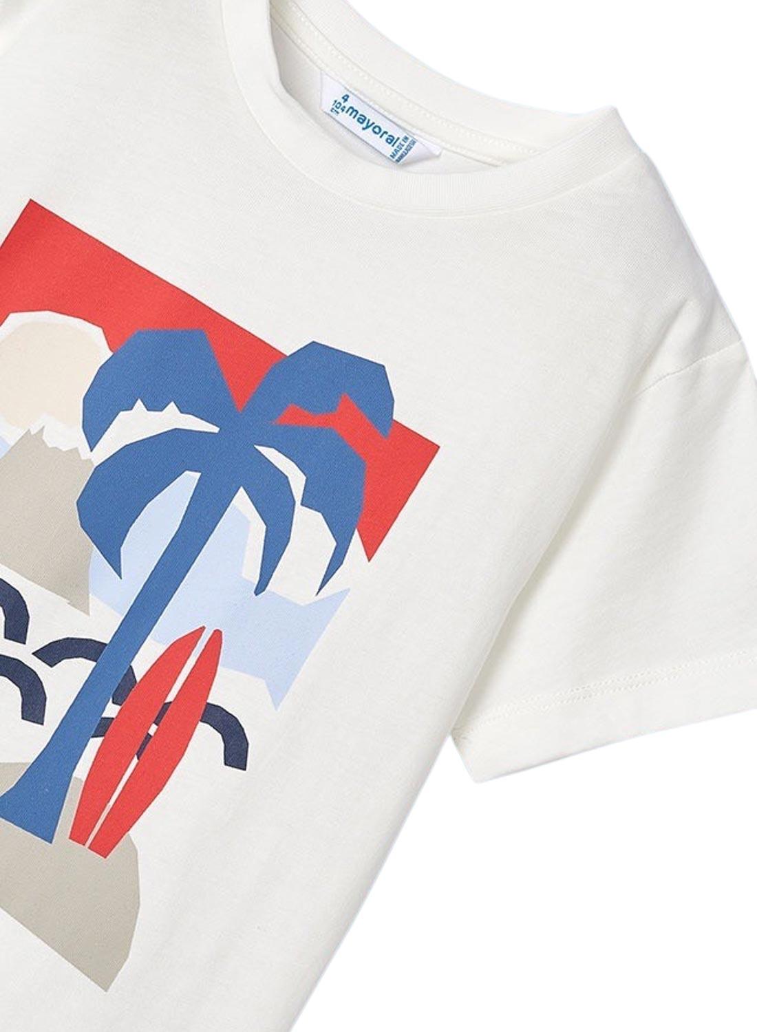 Conjunto Mayoral. 2 peças. Camiseta cor branca. Gola redonda. Manga curta. Estampado com palmeira na parte da frente. Bermuda cor azul. Bolsos laterais. Formato regular.