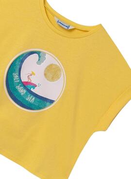 Camiseta Mayoral. Cor amarela. Estampado no peito. Manga curta. Formato largo. Mangas dobradas.