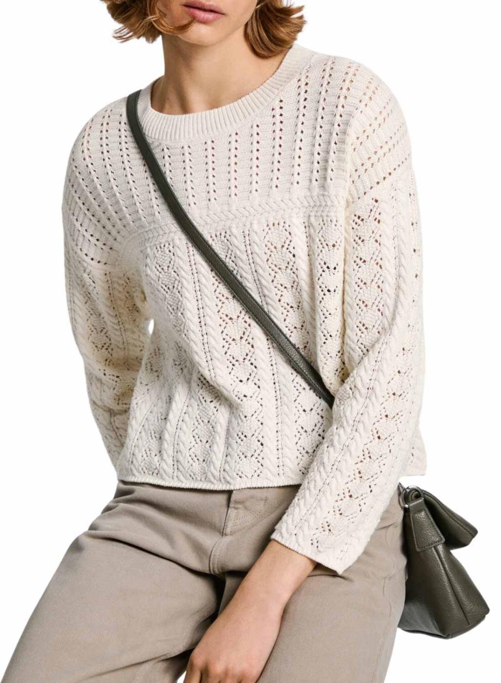Camisola Pepe Jeans. Modelo Isadora. Cor bege. Gola redonda. Ajuste largo. Extremidades caneladas. Tecido com entrelaçados.