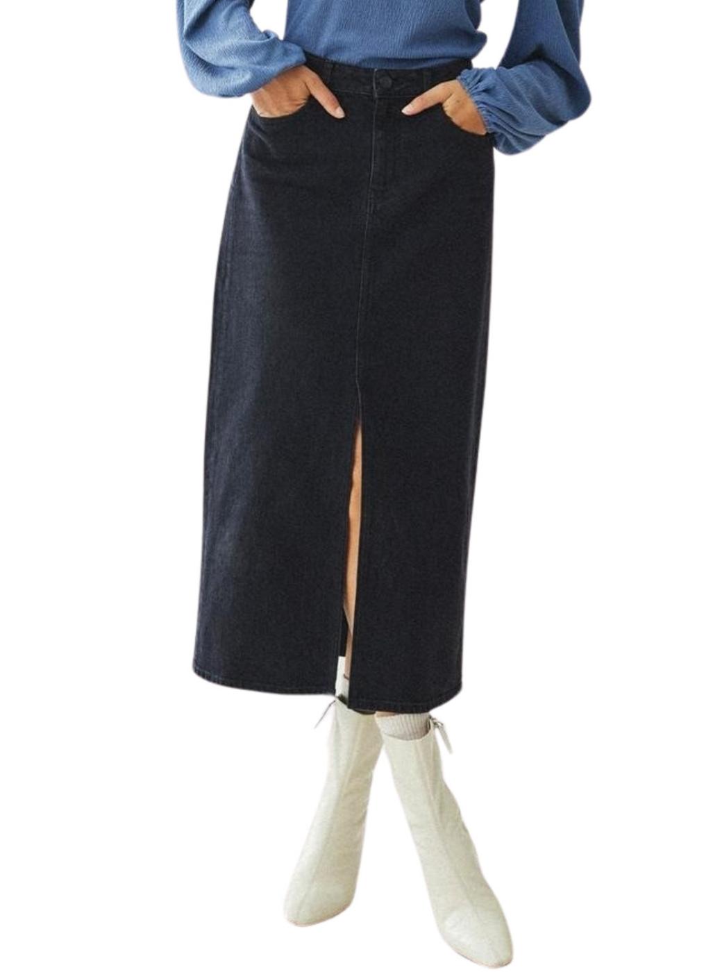Saia Vila. Modelo Vijaf. Cor preto. Denim. Corte midi. Cinco bolsos. Abertura frontal. Fechamento com botão e zíper.