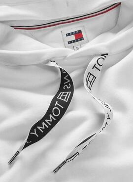 Moletom Tommy Jeans. Modelo Boxy Fit. Cor branca. Capuz ajustável com cordão. Bolso canguru na parte da frente. Acabamentos canelados de malha elástica. Cordões do capuz em contraste com detalhes distintivos da marca. Ombro levemente caído. Corte folgado. Interior aveludado.