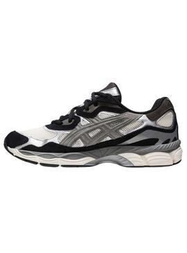 Tênis Asics. Modelo Gel NYC. Cor cinza e preto. Painéis em contraste. Estilo chunky. Sola volumosa. Fecho com cadarço. Logo lateral.
