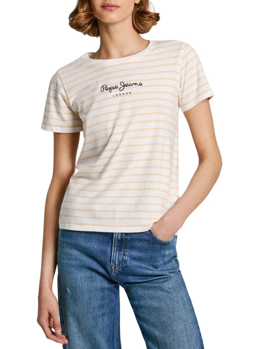 Camiseta Pepe Jeans. Modelo Elba. Cor creme com listras amarelas estampadas. Logo no peito. Manga curta. Gola redonda. Ajuste regular.