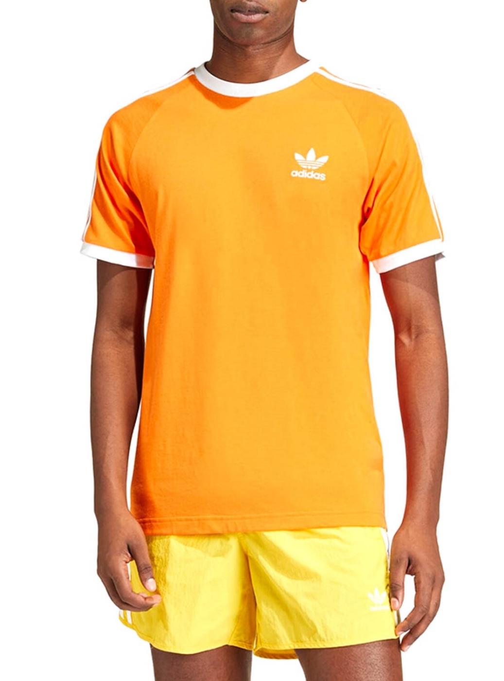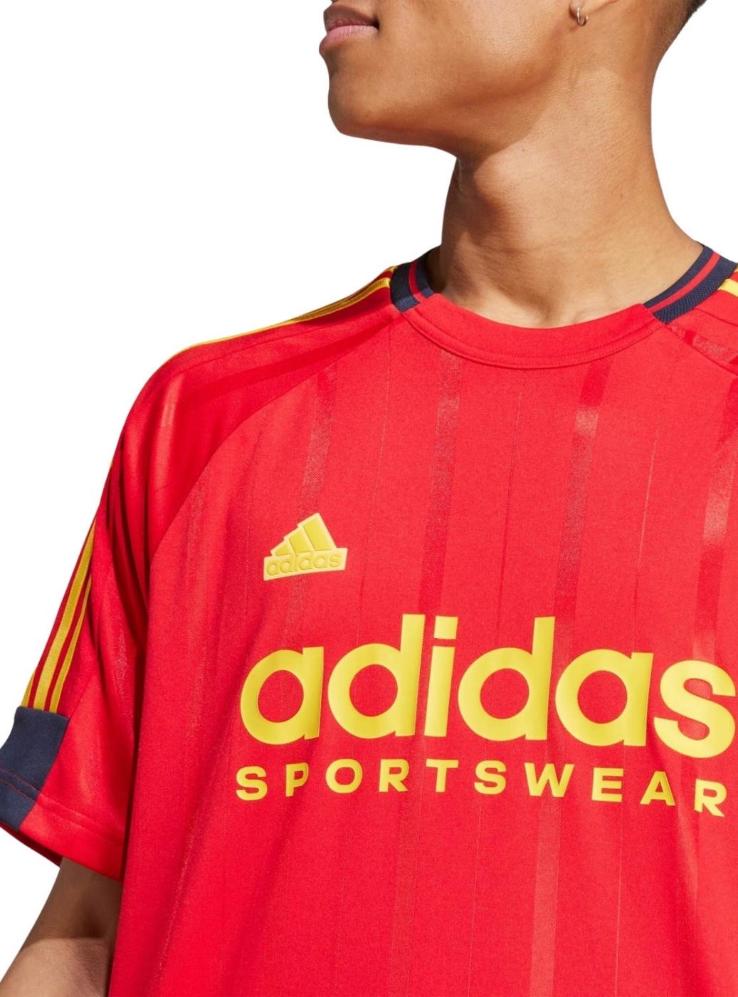 Camiseta Adidas. Modelo Nations. Cor vermelha. Manga curta. Gola redonda. Estampa gráfica no peito. Listras de contraste nos ombros. Ajuste regular.