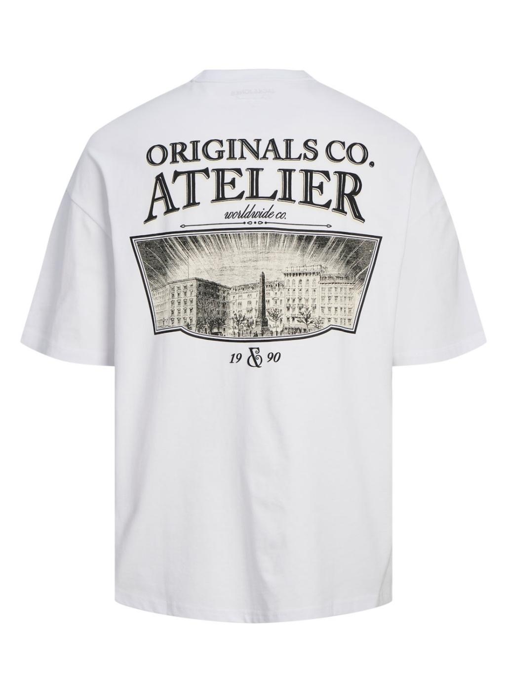Camiseta Jack and Jones. Modelo Santorini. Cor branca. Mensagem estampada no peito. Ilustração vintage estampada nas costas. Ajuste folgado.