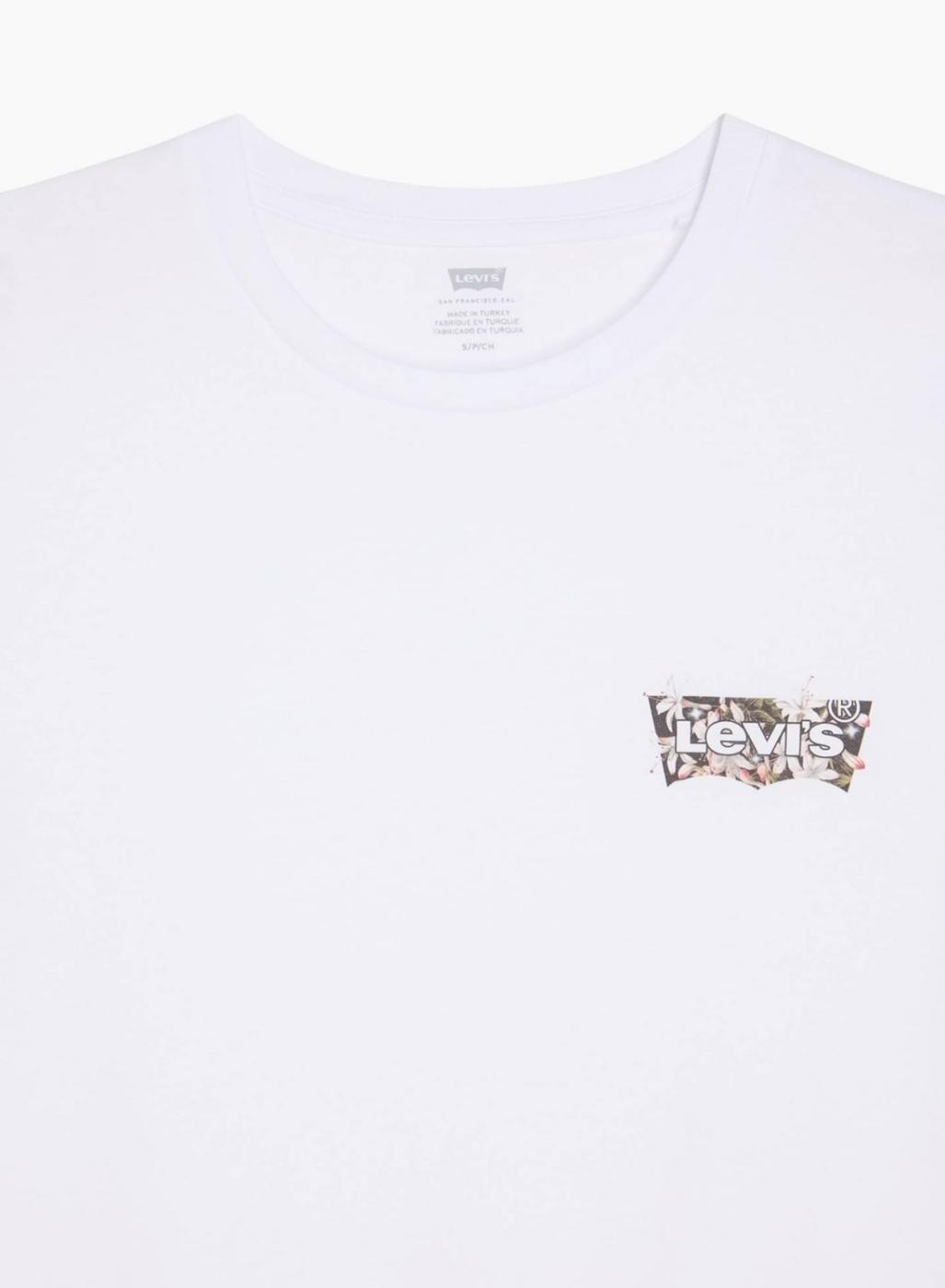 Camiseta Levis. Modelo The Perfect Tee. Cor branca. Gola redonda. Manga curta. Ajuste slim. Etiqueta lateral da Levis. Logo estampado no peito com fundo floral.
