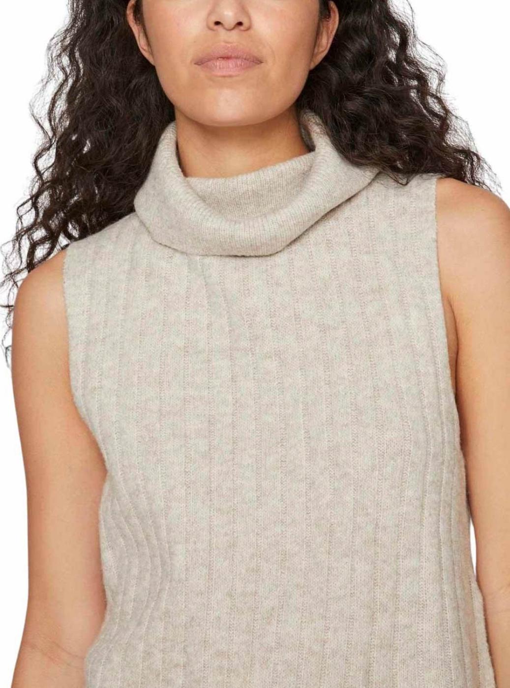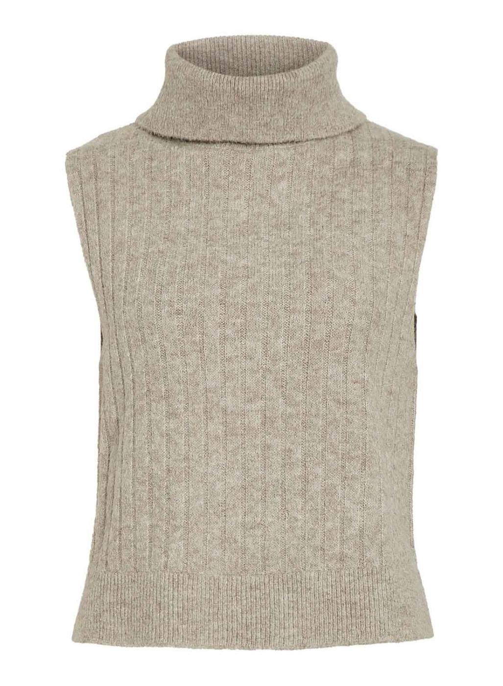 Colete Vila. Modelo Vibeluna. Cor bege. Gola alta com dobra. Tecido canelado. Ajuste regular.