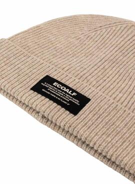 Gorro Ecoalf. Modelo Woolalf. Cor bege. Malha canelada. Dobrado embaixo. Etiqueta da marca na parte da frente.