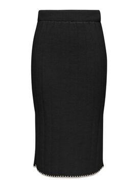 Saia Only. Modelo Chick. Cor preta. Tecido canelado. Cintura elástica. Corte midi. Abertura lateral. Costuras decorativas na parte inferior com linha contrastante.