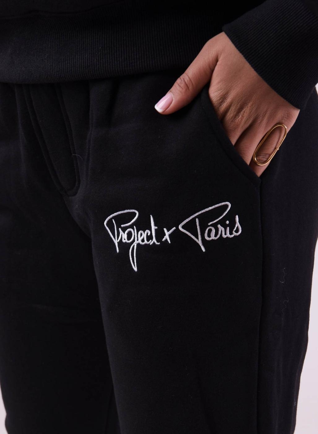 Calça Project x Paris. Cor preta. Modelo jogger. Logotipo bordado na cintura em branco. Cintura elástica com cordão. Punho na barra. Bolsos laterais.