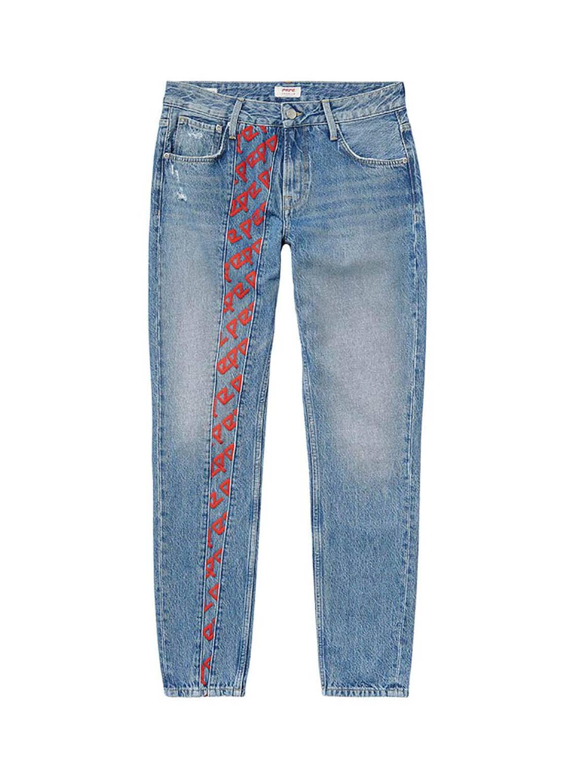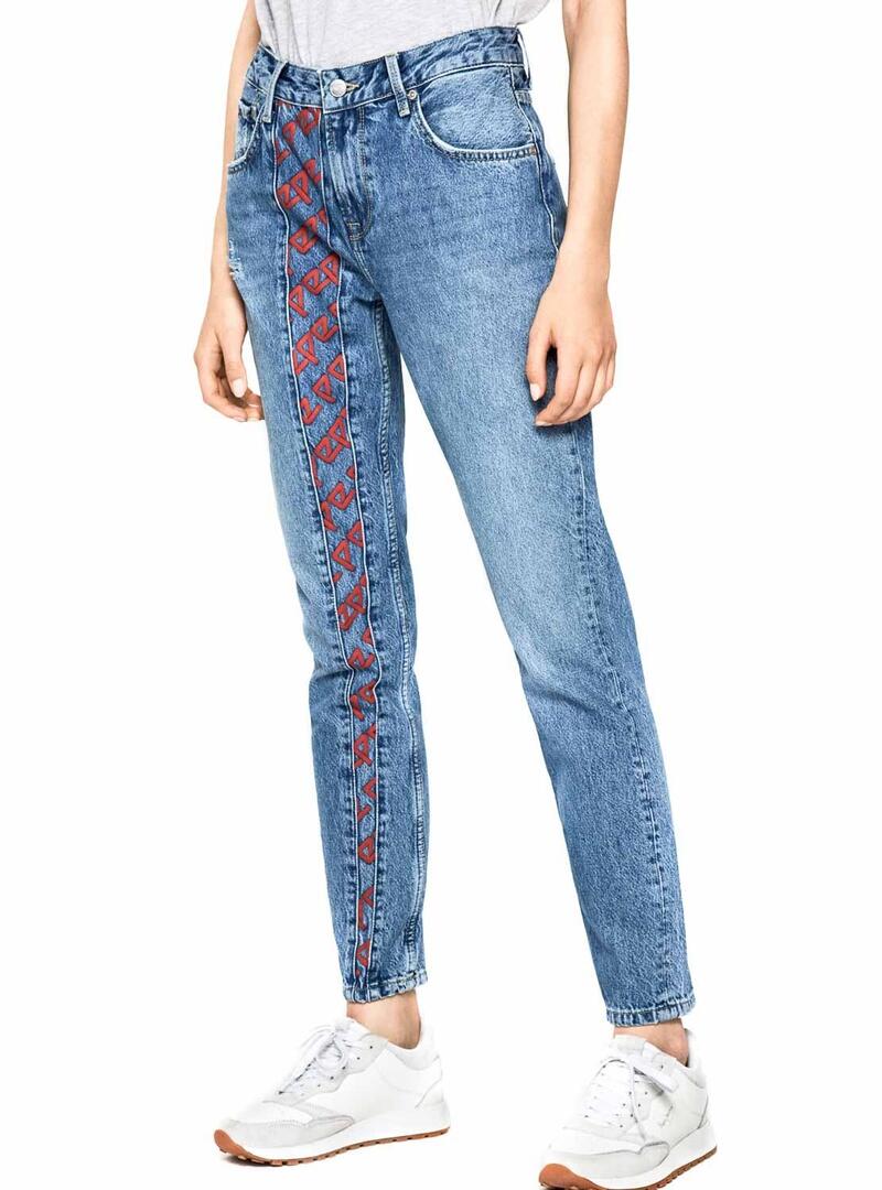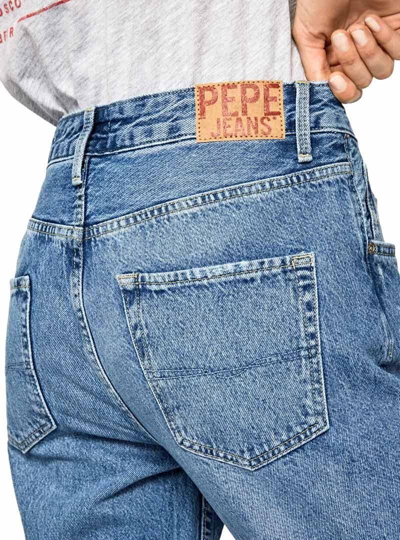 Jeans Pepe Jeans. Modelo Arquivo Violeta. 5 bolsos Cintura alta Lavagem média. logotipos da marca estampados em uma perna. Cenoura de perna. Corte solto
