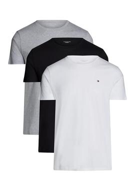 Pack de camisetas Tommy Jeans. Modelo básico. Gola redonda. Manga curta. Ajuste slim. Logotipo bordado no peito. Pack de três unidades. Cor branca, preta e cinza.