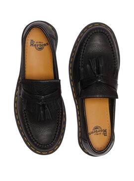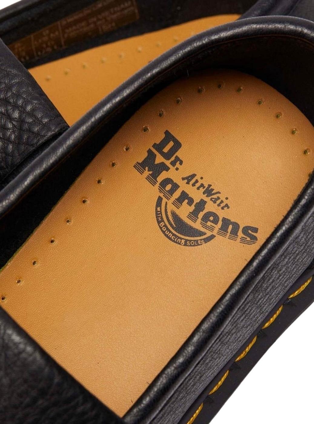 Mocassins Dr. Martens. Modelo Adrian. Cor preto. Sola de PVC com costura emblemática. Exterior em pele texturizada e engraxada. Franja superior. Interior em 60% couro e 40% têxtil.