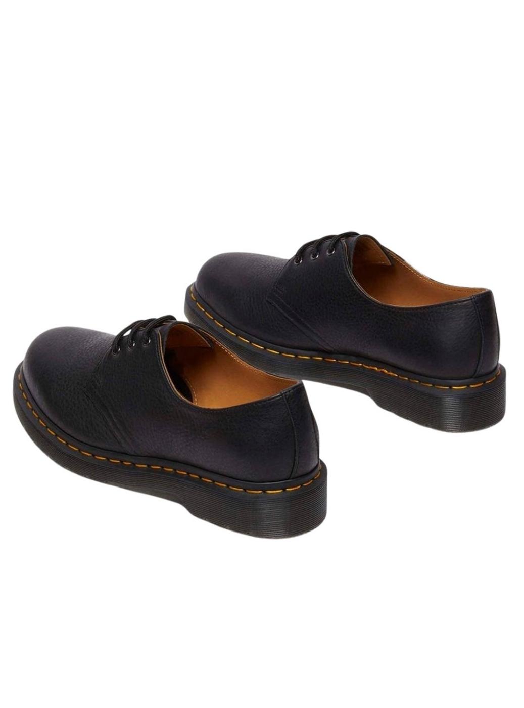Sapato Dr Martens. Modelo 1461. Cor preto. Couro texturizado com acabamento engraxado e toque suave. A sola é reforçada com a icônica costura amarela. Puxador de calcanhar. Fecho com cadarço de três ilhós. Sola de PVC.