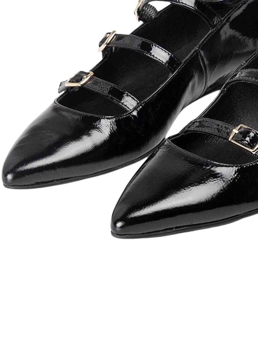 Sapatos Popa. Modelo Ainhoa. Estilo Mary Jane. Cor preto. Ponta fina. Material envernizado. Três tiras ajustáveis com fivelas douradas.