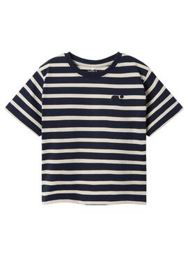 Camisa Name It. Modelo Torine. Cor azul e branco. Estampa com listras horizontais. Logotipo bordado no peito.