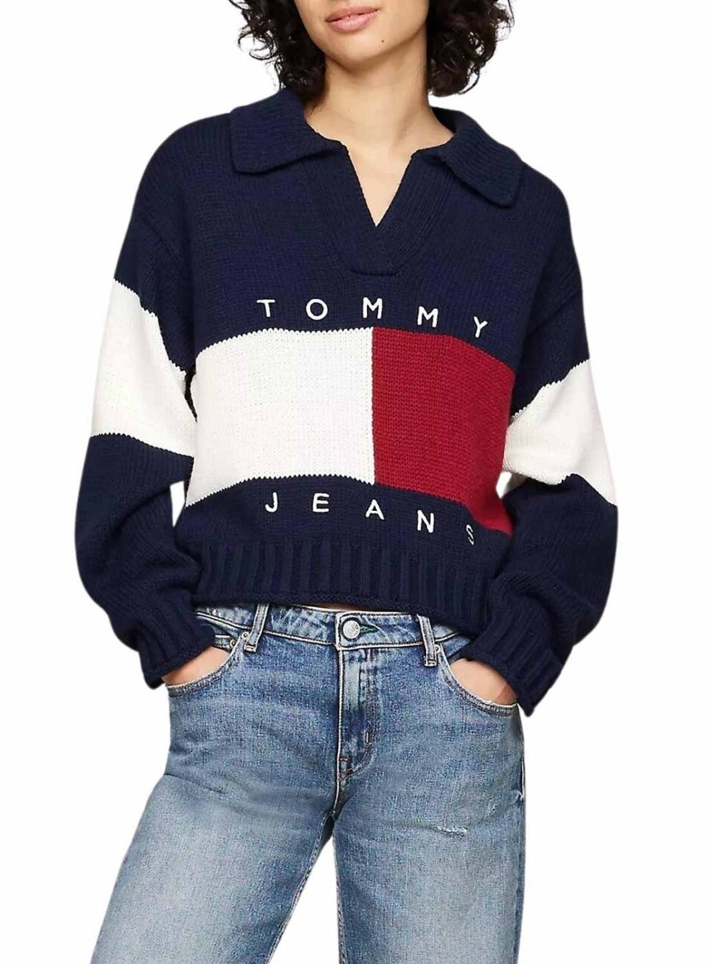Camisola Tommy Jeans listrada em branco e azul Varsity para mulher.