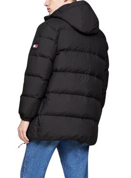 Parka acolchoada Tommy Jeans. Cor preta. Enchimento de penas. Com capuz. Fecho frontal com zíper duplo. Bolsos laterais. Bandeira da Tommy no peito. Patch da marca em uma manga. Detalhes distintivos da Tommy Jeans. Bolso no interior. O modelo está usando o tamanho M.