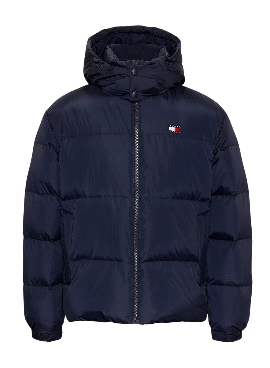 Jaqueta Tommy Jeans. Modelo Alaska. Cor azul marinho. Tecido acolchoado repelente à água. Com enchimento de penas. Fecho de correr. Gola alta. Capuz removível. Bolsos laterais. Punhos elásticos. Emblema da Tommy no peito. Grande logotipo da marca nas costas. O modelo veste o tamanho M. Peso das penas: 235g.